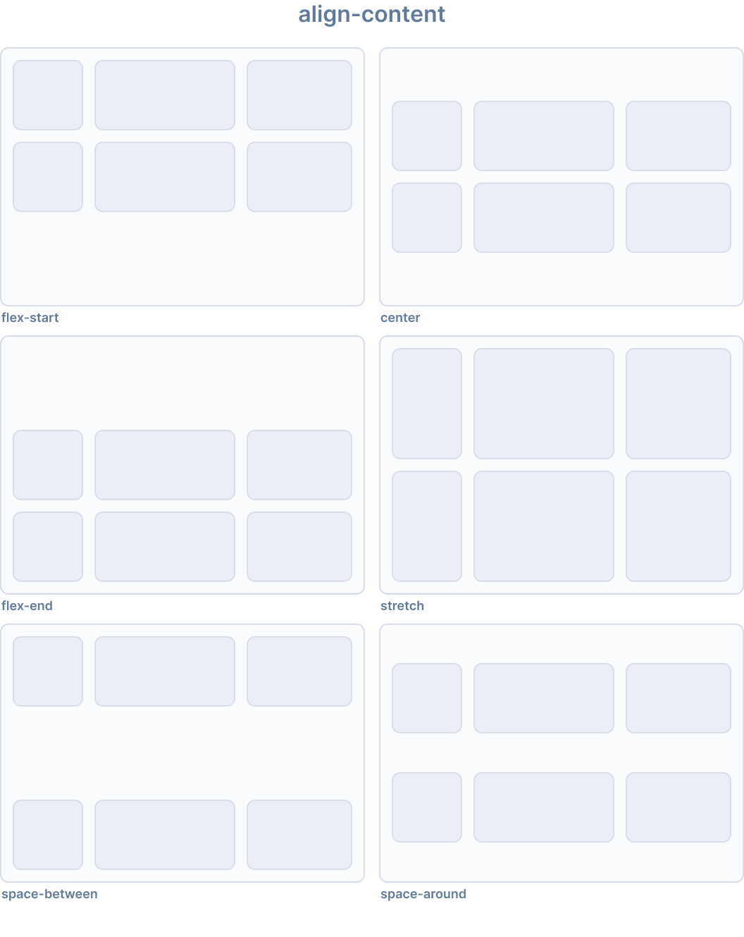 The table below shows the default behavior, where {property} is one of the following: justify-content, align-content, align-items, flex, or flex-wrap, and {modifier} is the corresponding value as described above.